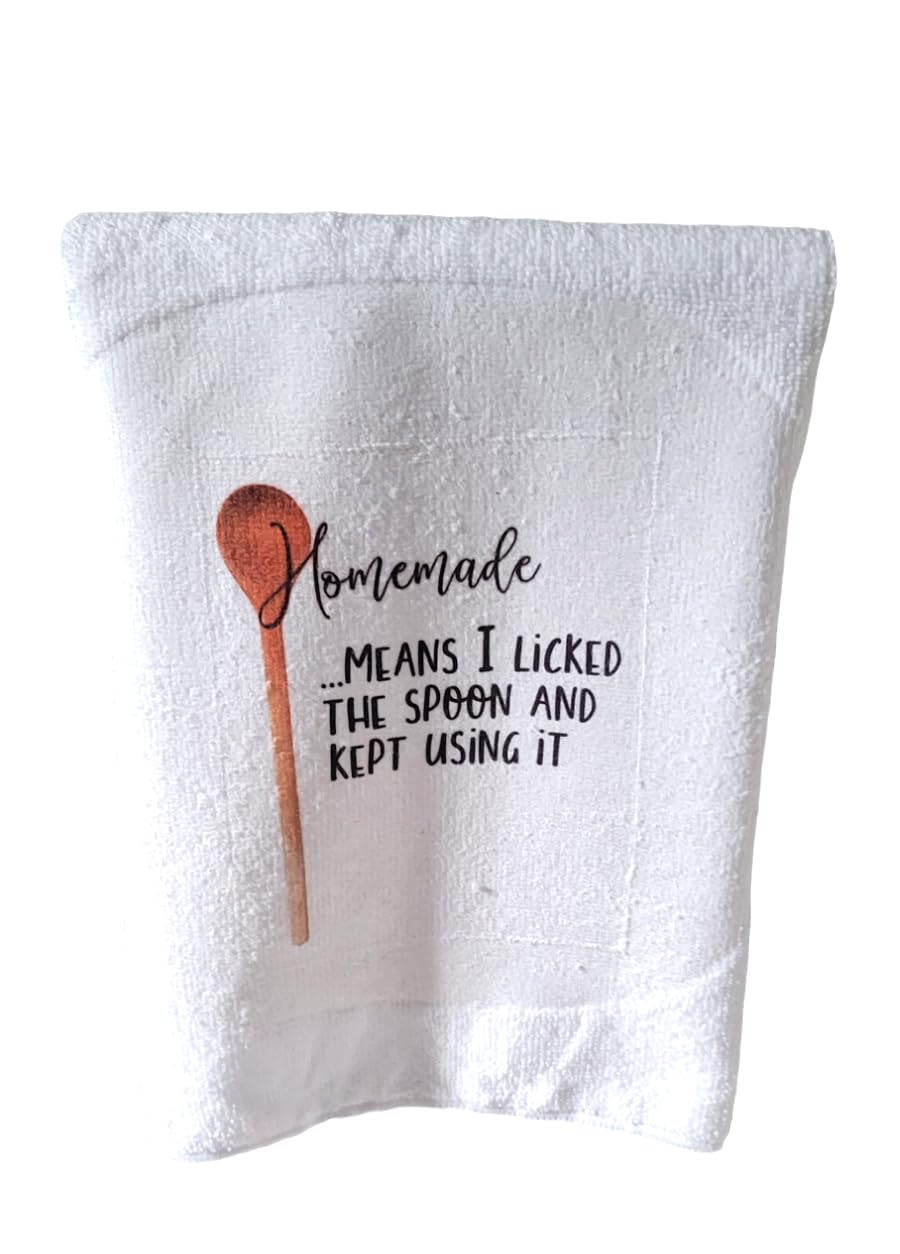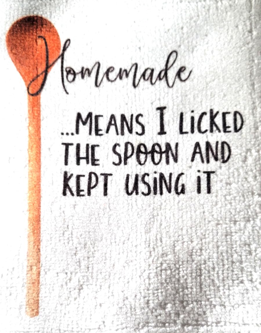 Kitchen Hand Towel. Hand Towel. Gift. Gag Gift. Funny Print. "Homemade ... Means I licked the spoon and kept using it"