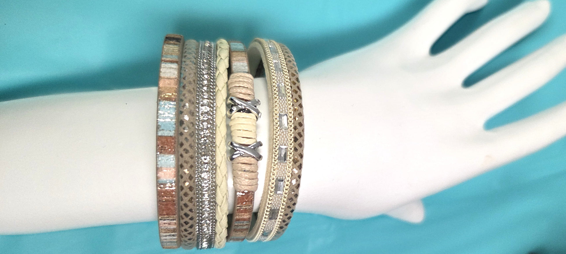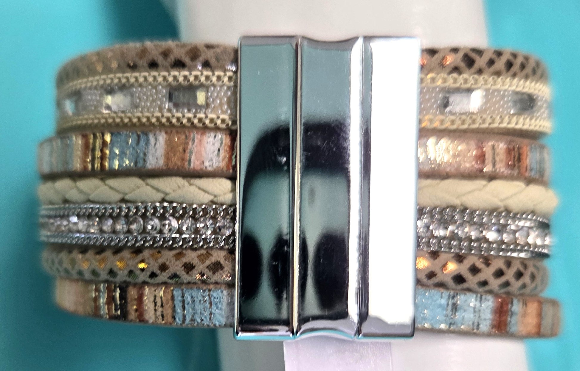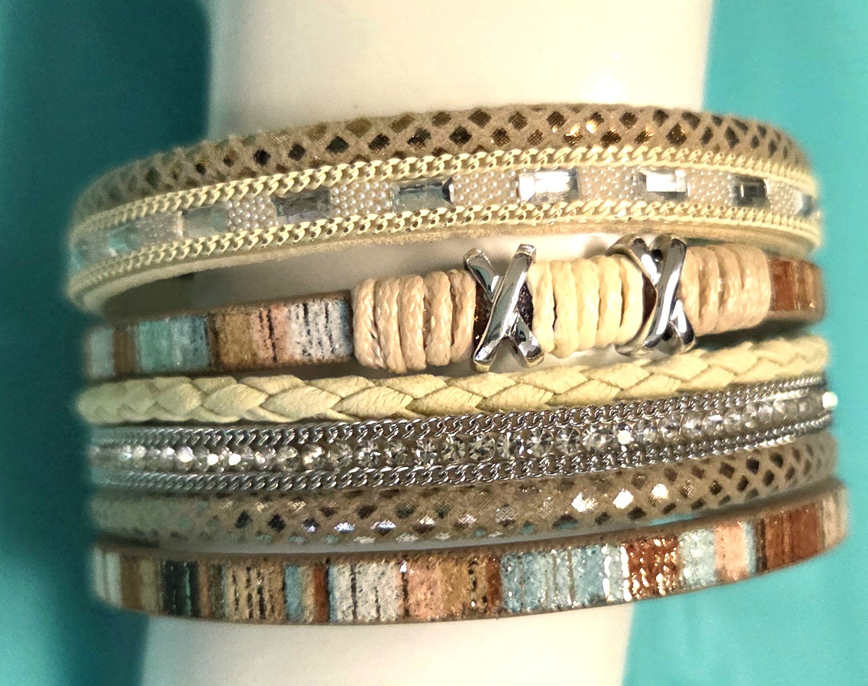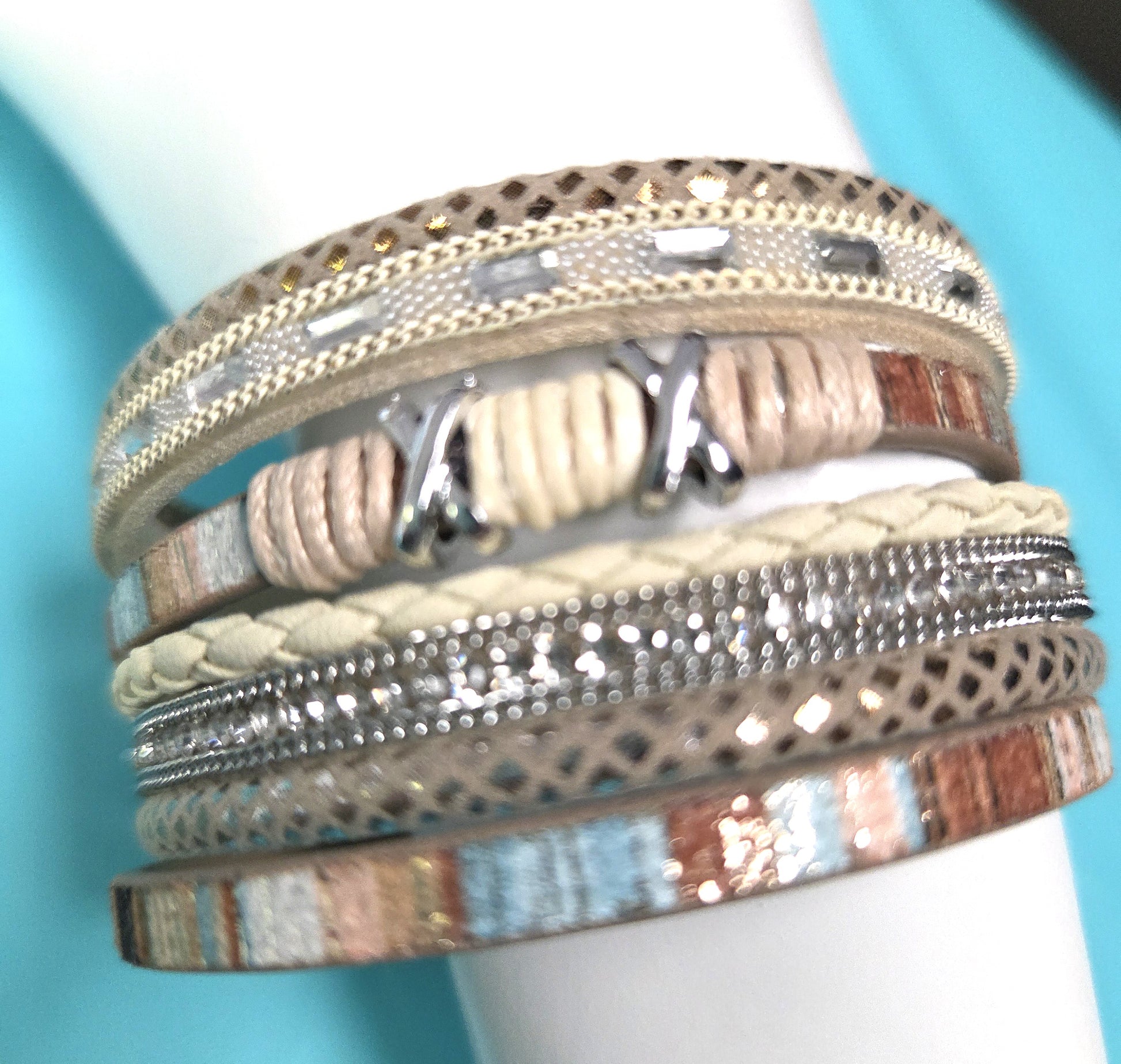 This multi-strand boho bracelet combines natural beige tones with a secure magnetic clasp for effortless wear. Its layered design adds texture and depth, complementing casual and chic outfits alike. Ideal for those seeking a versatile accessory that balances style with functionality.