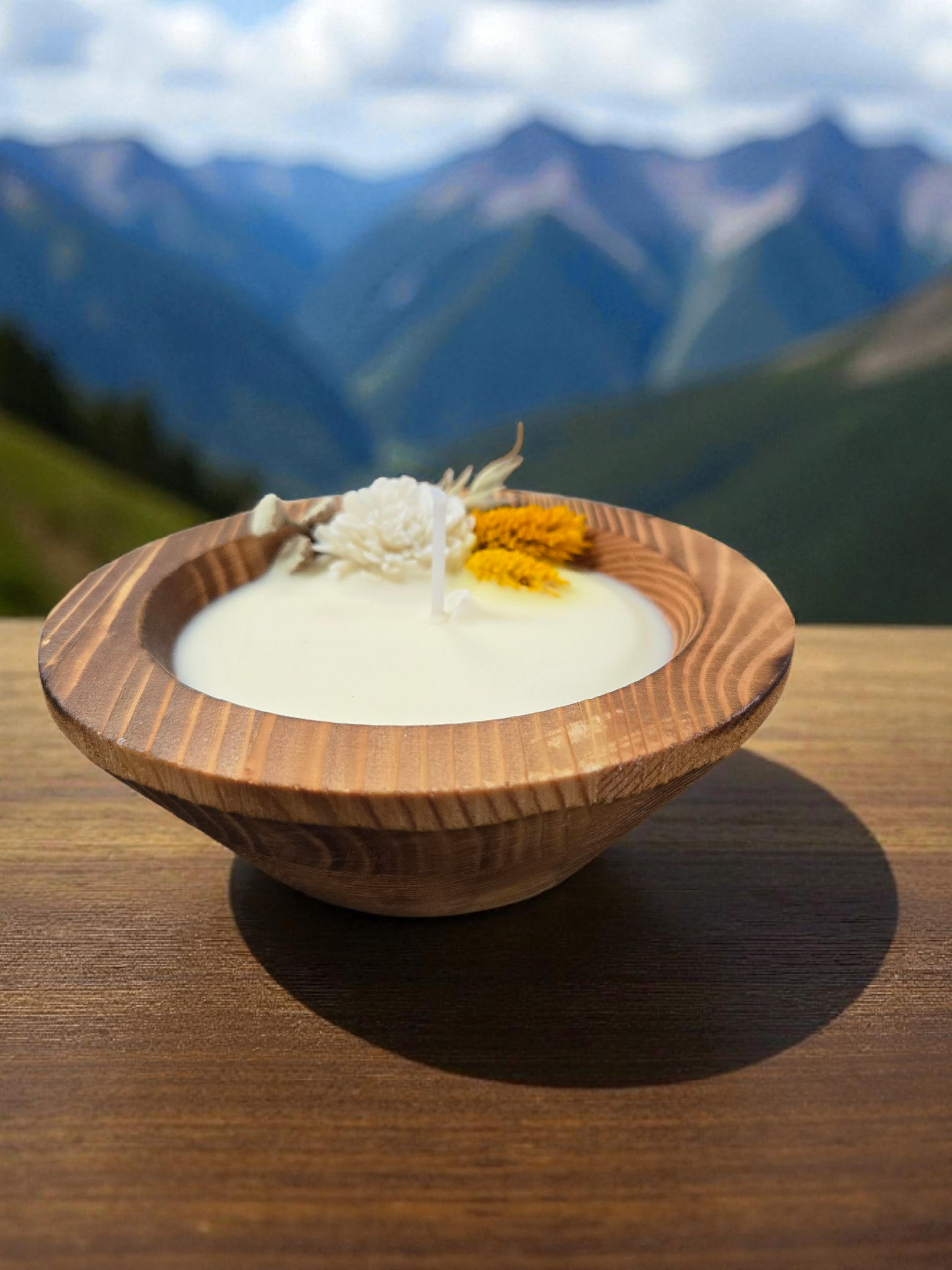 Mountain Lake Dough Bowl Candle 1 Wick Round with Dried Flowers